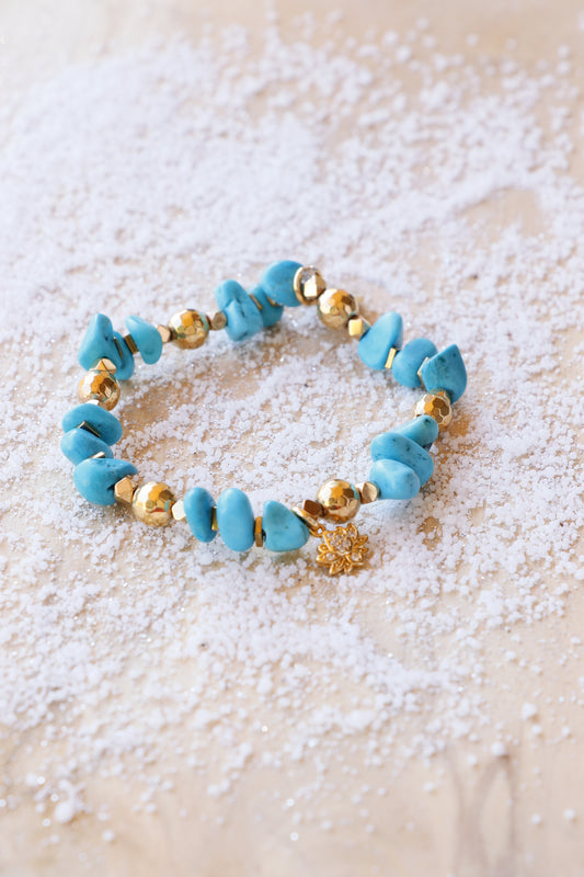 La Turquoise est une pierre naturelle bleu-vert à l’éclat mat ou veiné, souvent marbrée de brun ou de noir. Elle évoque à la fois la profondeur de l’eau et la force de la terre, et c’est ce qui la rend si précieuse pour retrouver stabilité, clarté et communication juste.