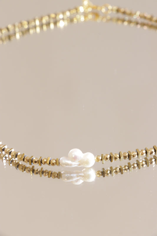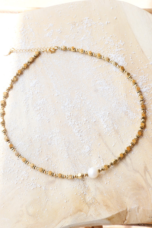 Collier tour de cou perle orient blanc DHĀRAṆĀ stabilité et ancrage émotionnel en hématite plaquée or