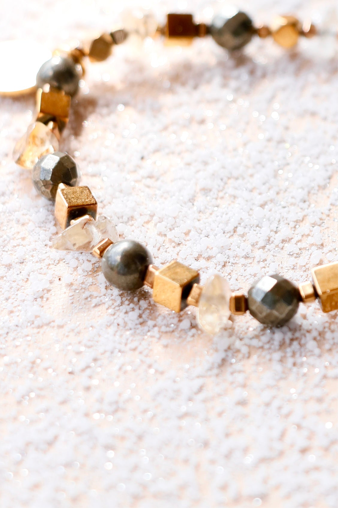 Le bracelet VIBHUTI en pyrite est un bijou bohème chic de haute fantaisie signé Emmanuelle Bijoux Création.