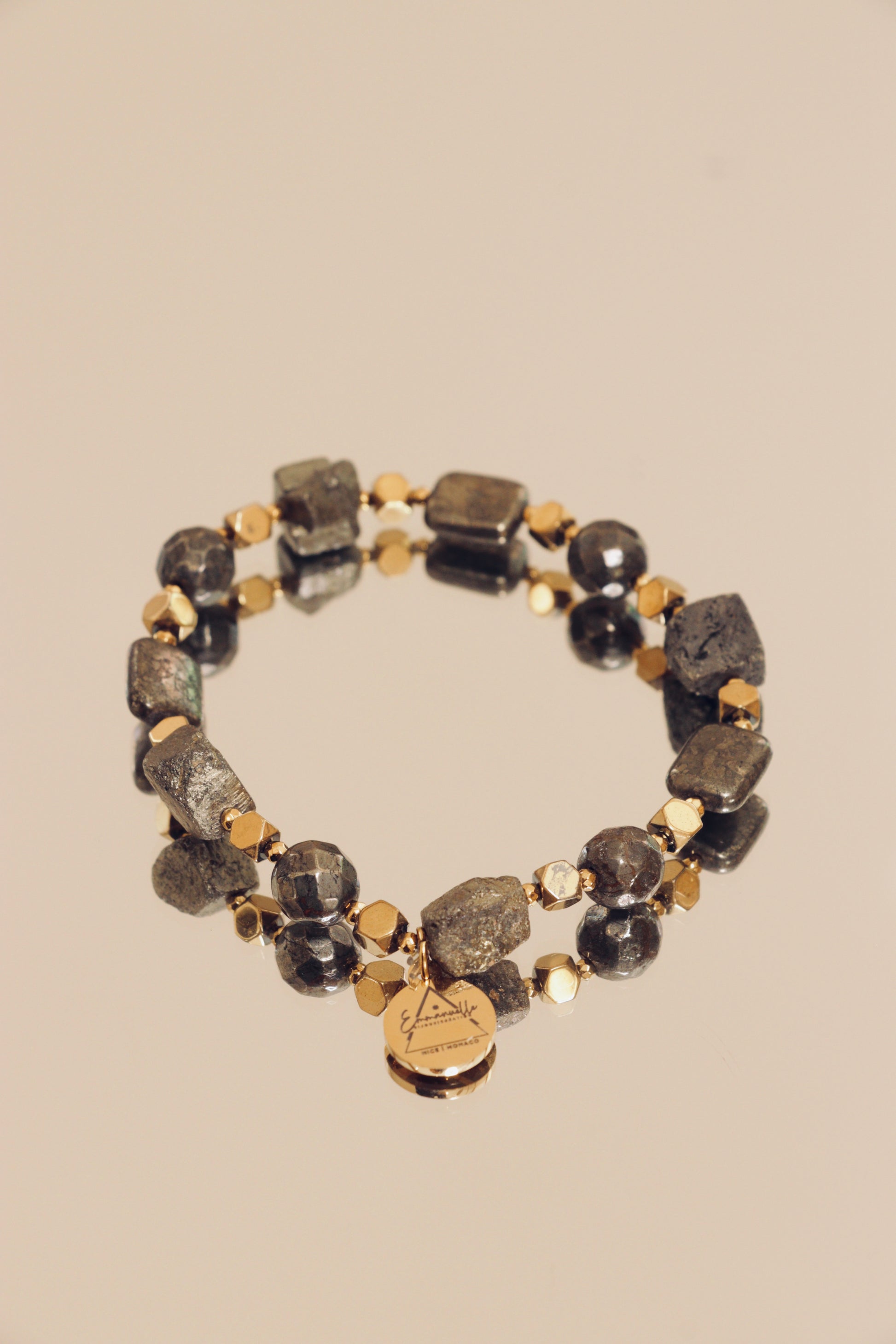 Le bracelet VIBHUTI en pyrite est un bijou bohème chic de haute fantaisie signé Emmanuelle Bijoux Création.