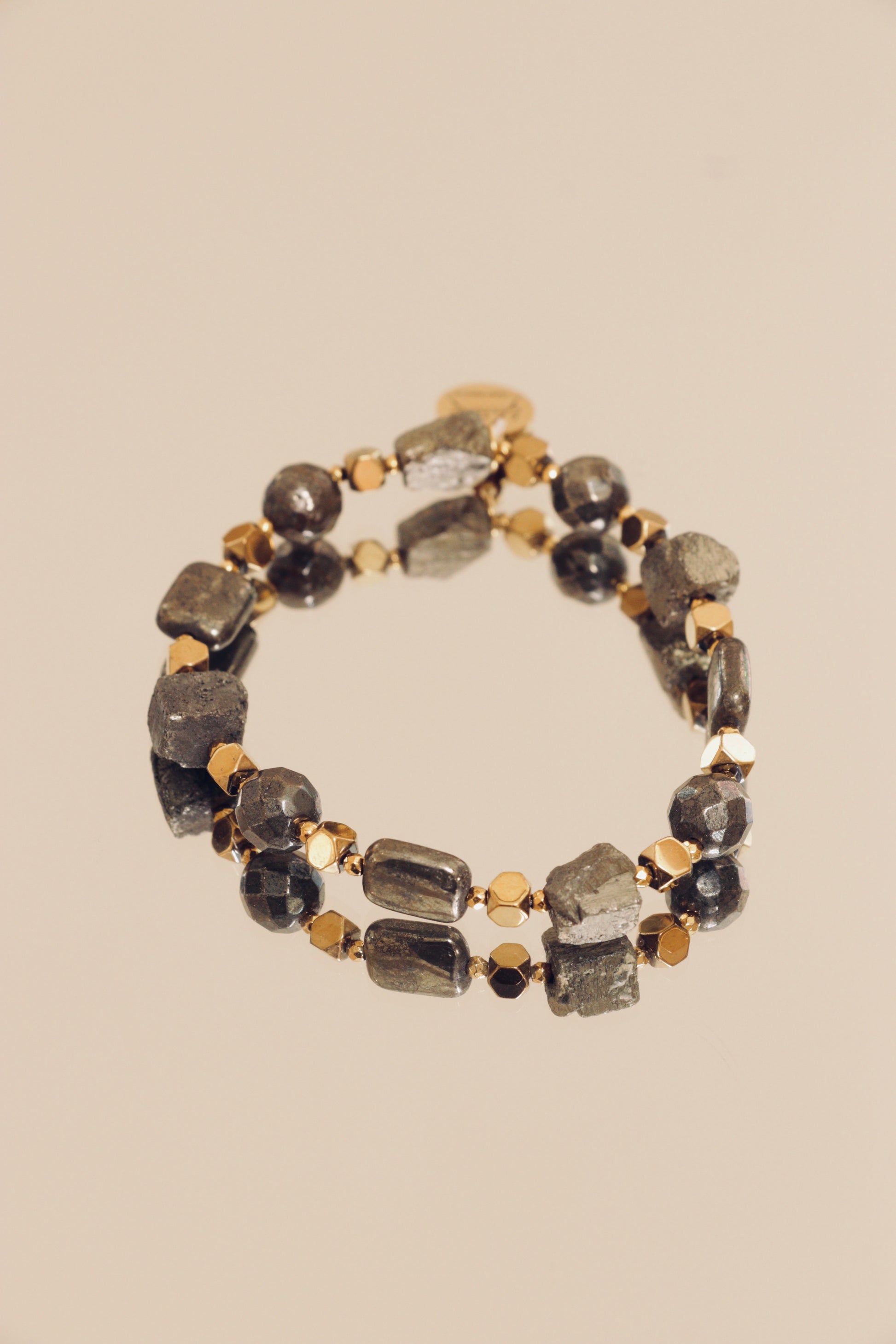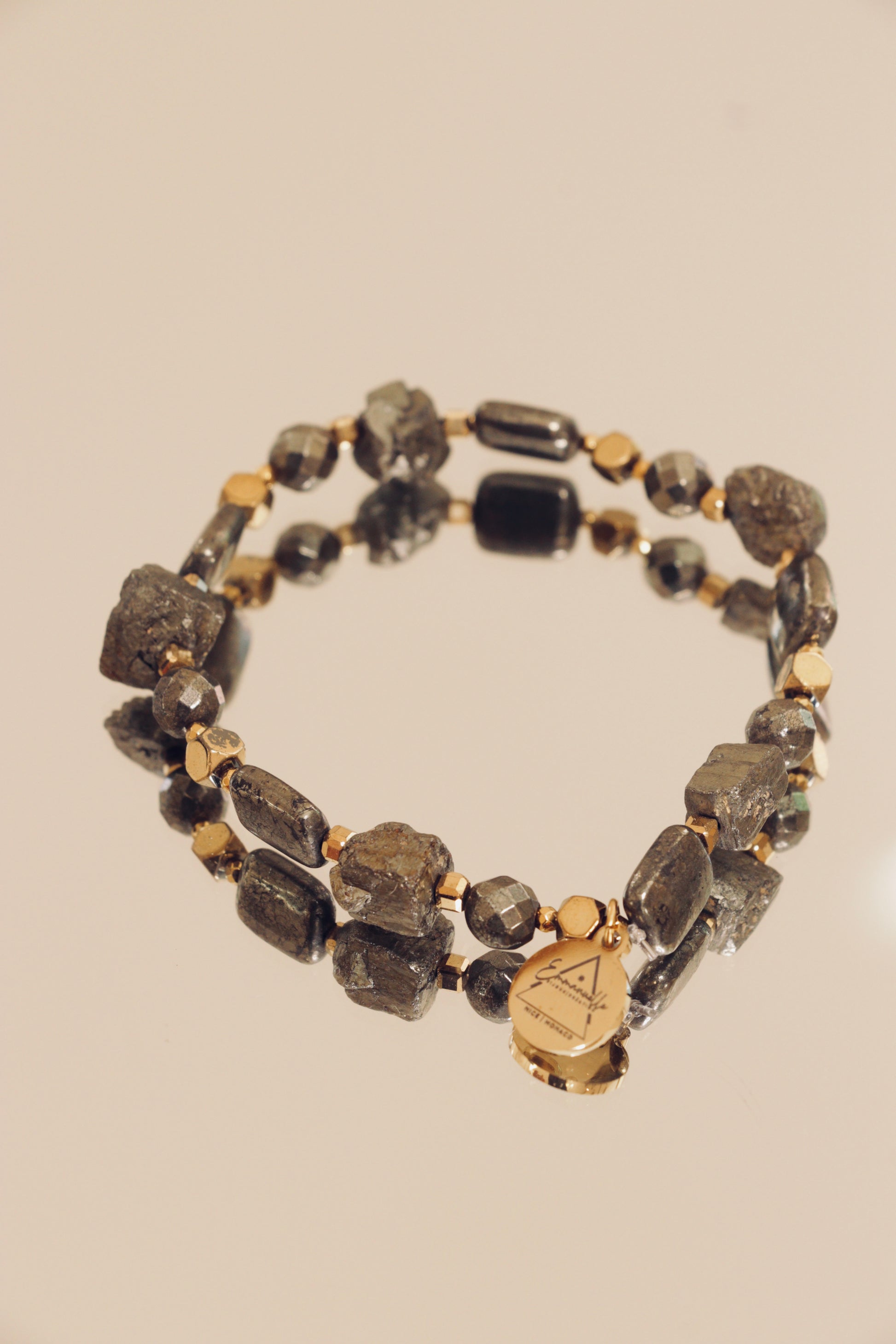- Pierre principale : Pyrite naturelle (perles 6 à 8 mm)