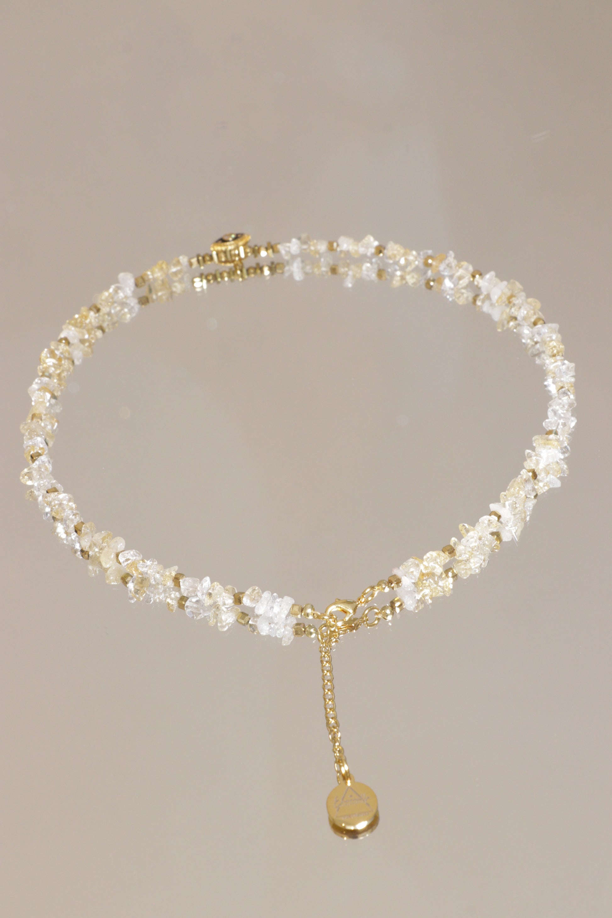 Ce collier rend hommage à cette énergie solaire avec la citrine, pierre vibrante de succès, d’optimisme et de rayonnement personnel. Conçu comme un véritable talisman de lumière, le collier LAKSHMI invite à manifester l’abondance, à cultiver la joie intérieure et à attirer les opportunités.