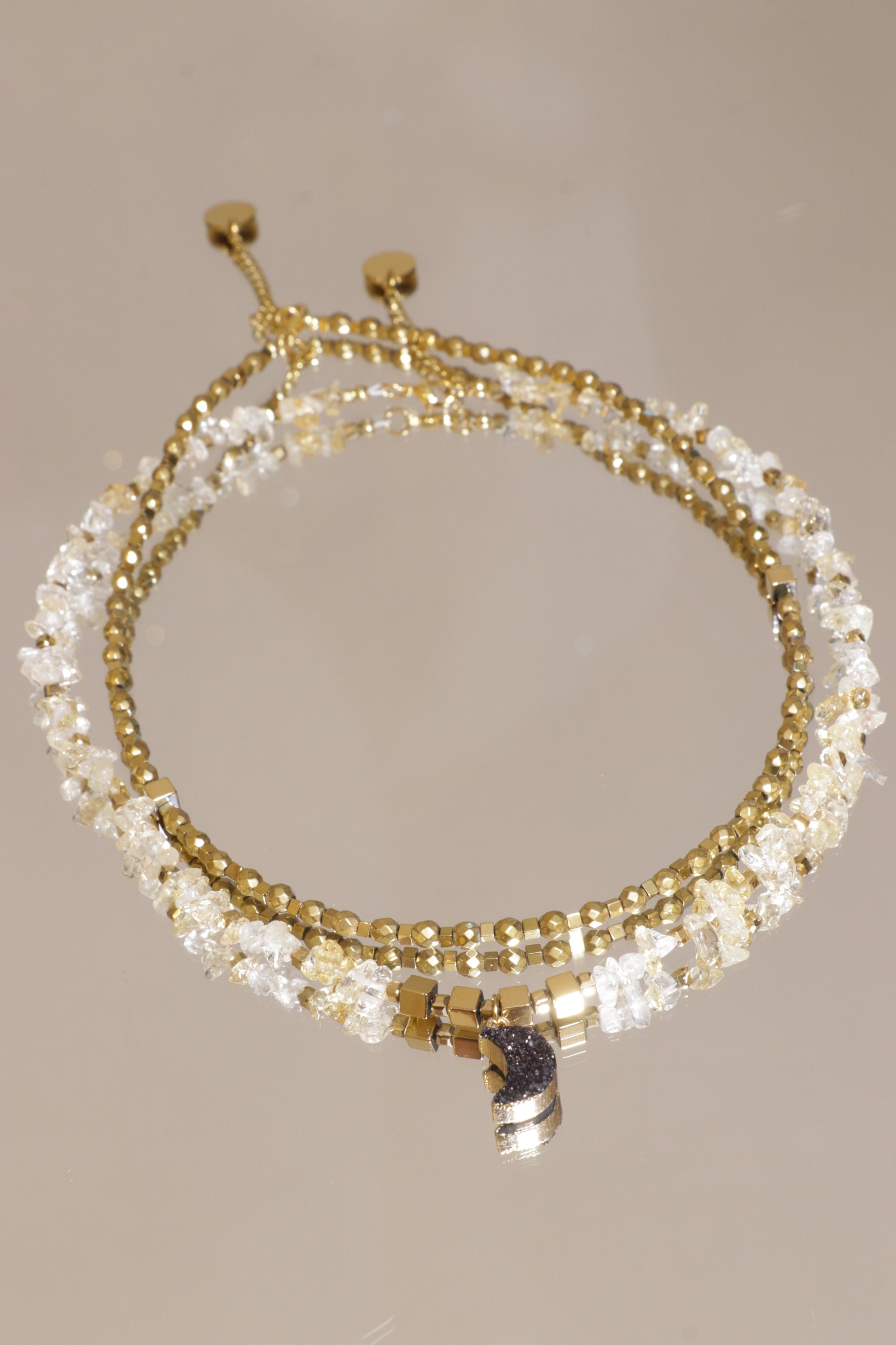 Tous nos modèles sont montés sur une base en hématite plaquée or, pierre d’ancrage et de structure émotionnelle. Elle soutient l’éclat doré de la citrine tout en stabilisant son énergie ascendante. Ensemble, elles créent un duo vibrant entre lumière et solidité.
