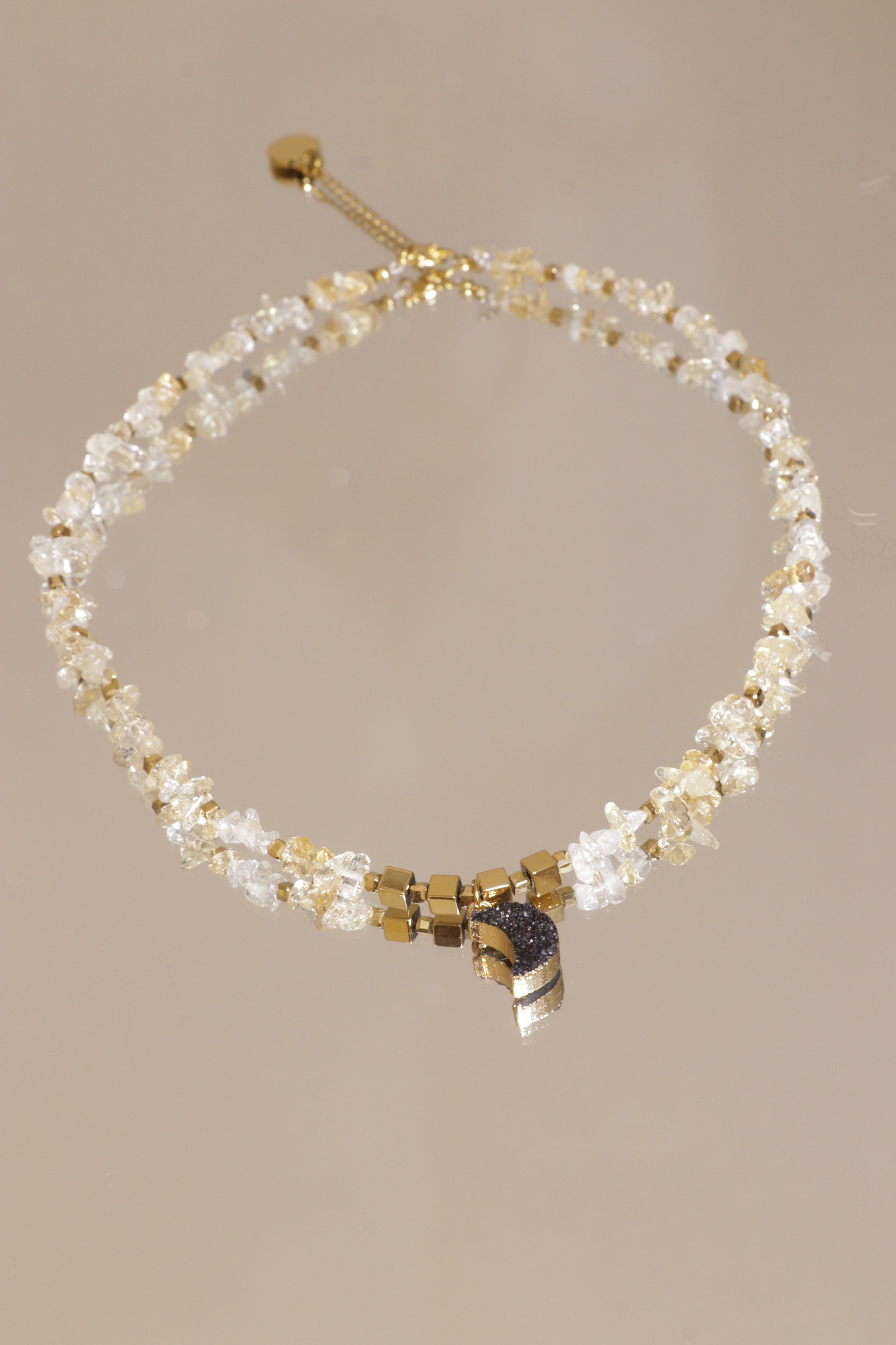 Ce collier rend hommage à cette énergie solaire avec la citrine, pierre vibrante de succès, d’optimisme et de rayonnement personnel. Conçu comme un véritable talisman de lumière, le collier LAKSHMI invite à manifester l’abondance, à cultiver la joie intérieure et à attirer les opportunités.