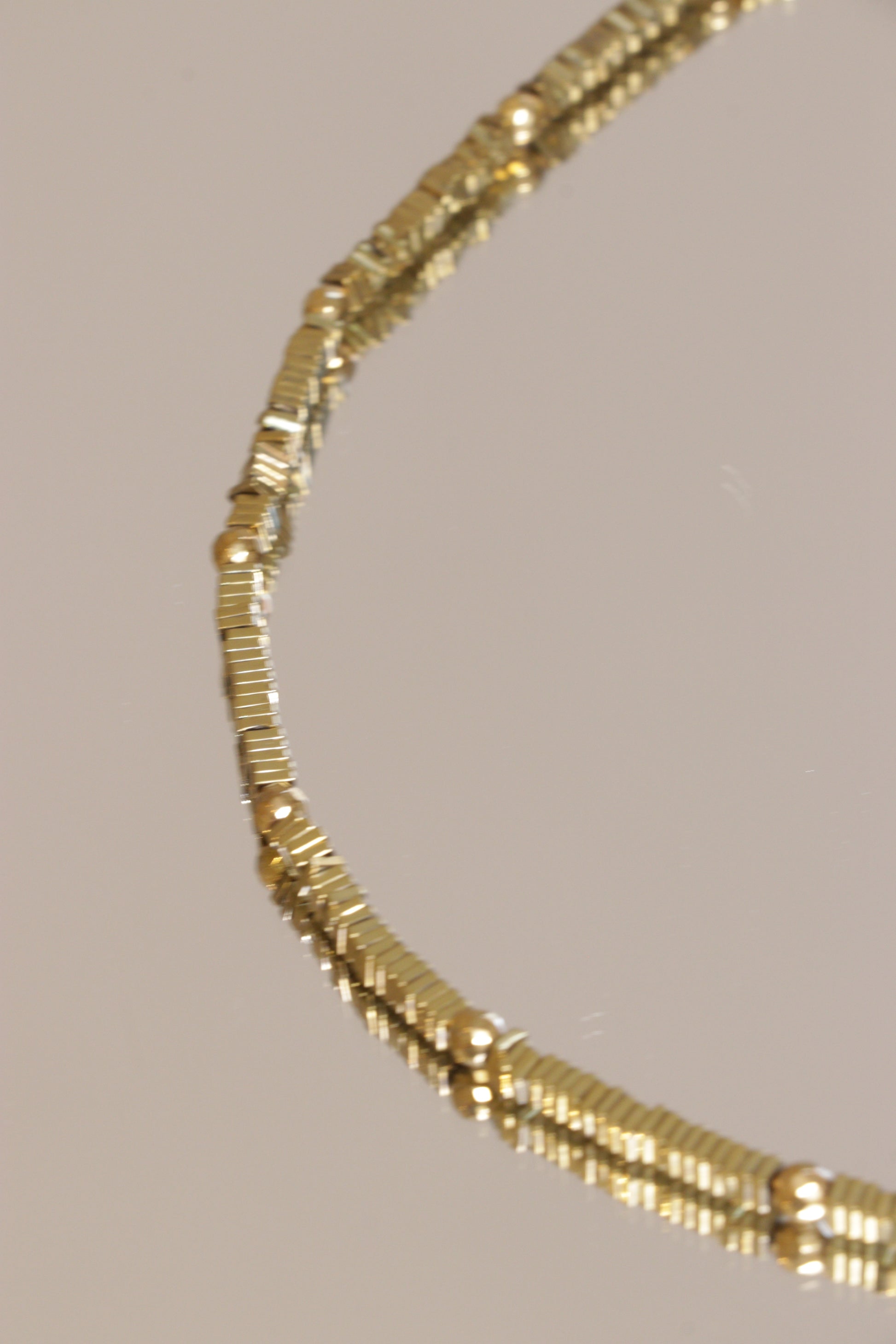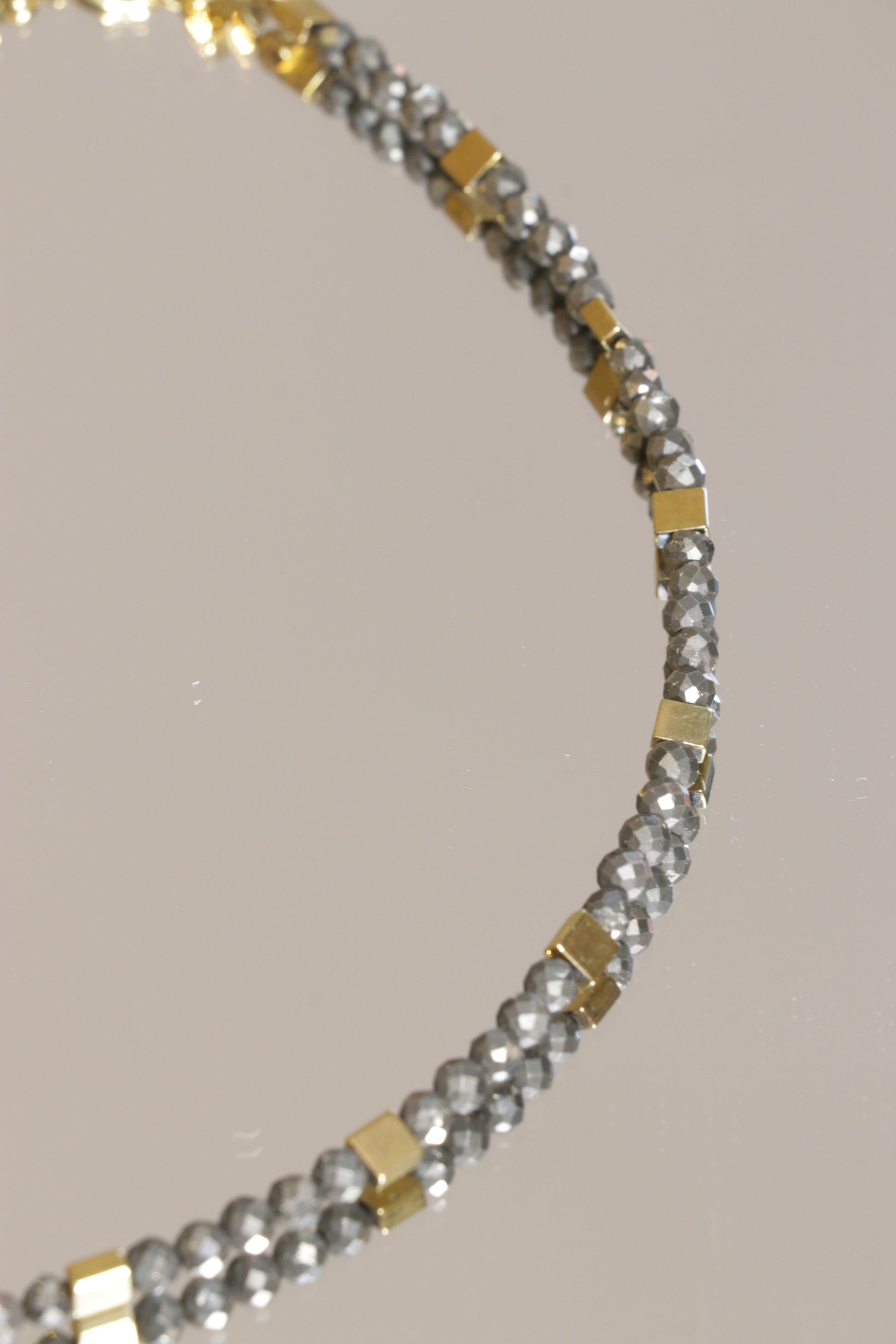 Monté sur une base en hématite plaquée or , ce bracelet allie la structure dorée de la pyrite à l'ancrage subtil de l'hématite, créant un équilibre parfait entre élévation et enracinement. Chaque pièce est énergétiquement alignée et montée à la main .